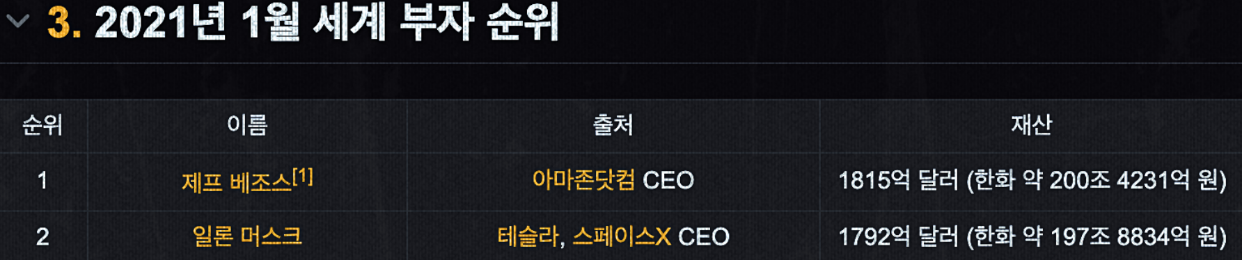 현재 세계 최고 갑부 1위는 아마존의 제프 베조스 2위는 테슬라의 일론 머스크입니다. 현재 주가의 흐름에 따라 순위가 엎치락 뒤치락하는데요. 이 둘의 재산을 합치면 약 400조 원이 넘습니다.
