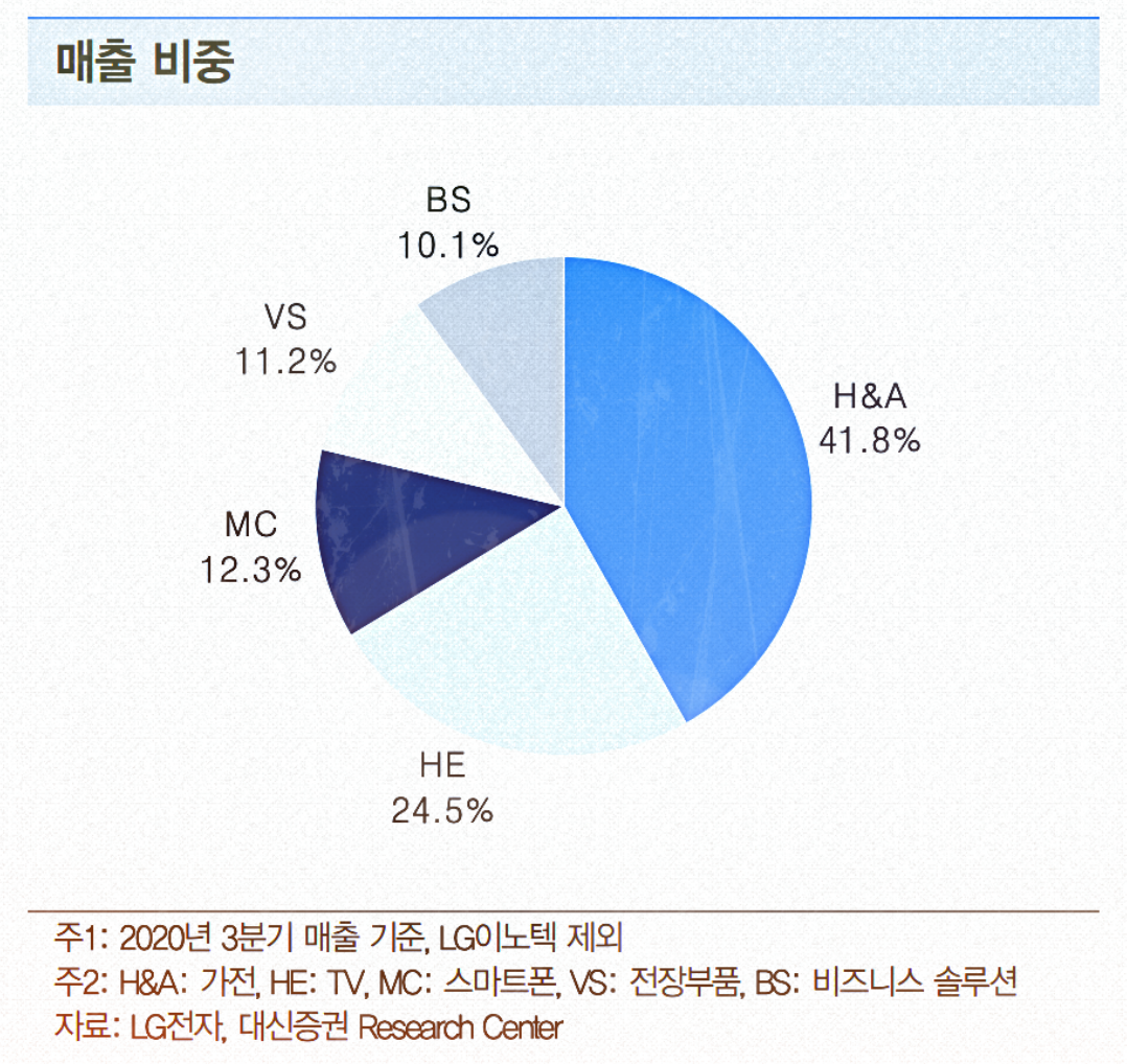 백색가전 하면 삼성보다 LG전자가 먼저 떠오르죠. 그만큼 현재까진 가전과 TV부문의 매출 비중이 큽니다. 앞으로 VS(전장부품) 분야의 비중이 높아질 것으로 보입니다. 해당 사업은 LG디스플레이와도 연관이 큽니다. 현재 벤츠에도 LG디스플레이가 들어가고 있죠.